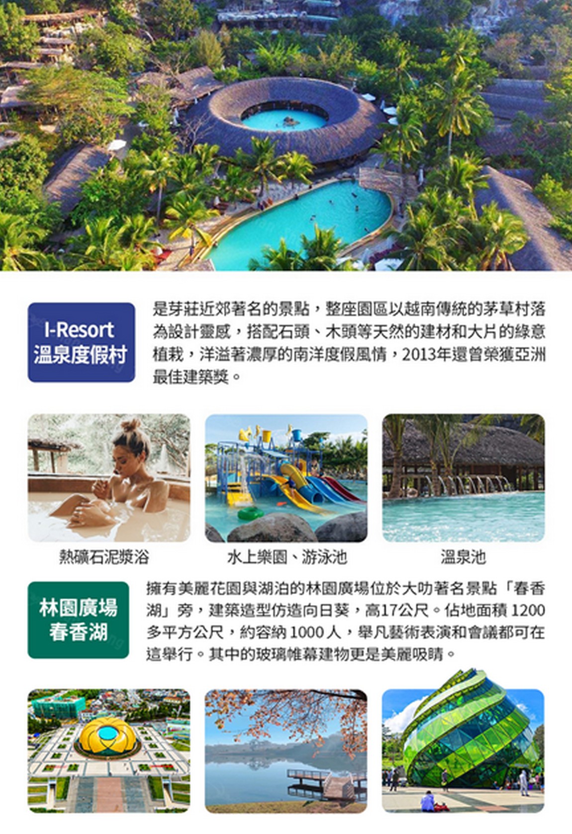 I-Resort 溫泉度假村是芽莊近郊著名的景點,整座園區以越南傳統的茅草村落為設計靈感,搭配石頭、木頭等天然的建材和大片的綠意植栽,洋溢著濃厚的南洋度假風情, 2013 年還曾榮獲亞洲最佳建築獎。這裡提供一系列的護理和設施,包含溫泉池、溫泉水瀑、熱礦石泥漿浴、水上樂園、游泳池等,依照所選的門票各有不同的體驗,最受歡迎的泥漿浴同時也以去除死皮、緩解疲勞、撫平皺紋、紓解壓力等多重功用著稱,快來到 I-Resort 園區享受舒適的時光、撫慰日常的辛勞。